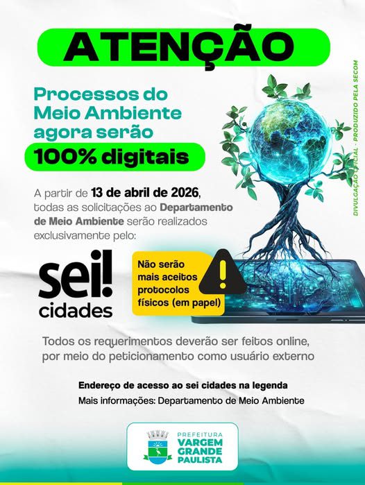 A Prefeitura de Vargem Grande Paulista anunciou uma importante modernização no atendimento do Departamento de Meio Ambiente, com a digitalização completa dos processos administrativos. A partir do dia 13 de abril de 2026, todas as solicitações e protocolos deverão ser realizados exclusivamente por meio do sistema SEI Cidades.