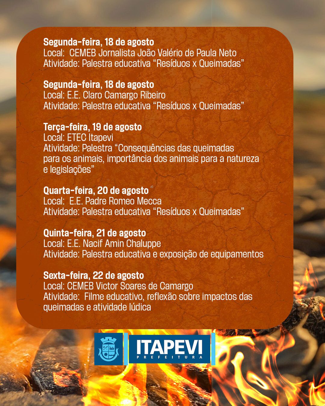 Campanha Contra Queimadas Urbanas | 11 a 22 de agosto A Prefeitura, em parceria com o Corpo de Bombeiros, reforça o alerta: queimada urbana é crime e ameaça a saúde e o meio ambiente! Montagem - Prefeitura De Itapevi (Redes Sociais/Reprodução)