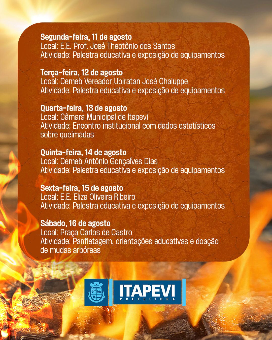 O objetivo é alertar a população sobre os riscos e prejuízos causados pelas queimadas, especialmente no período de estiagem, quando a vegetação seca e a baixa umidade do ar aumentam significativamente as chances de incêndios.
