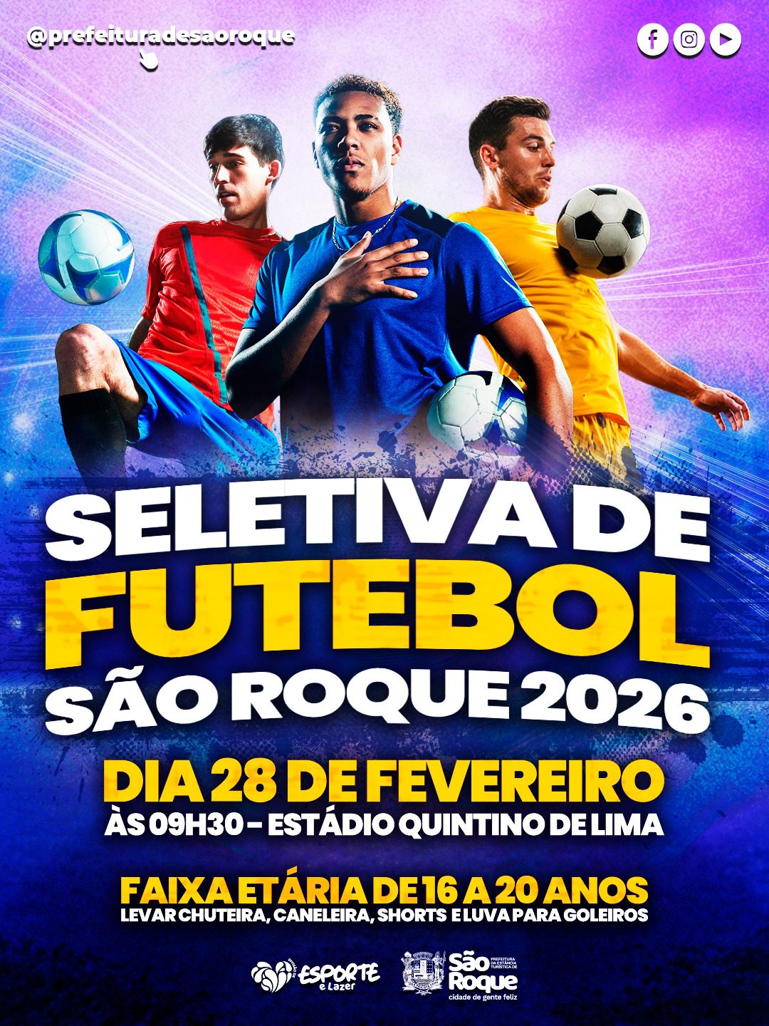 A Prefeitura de São Roque, por meio da Divisão de Esportes, realizará no sábado, 28 de fevereiro, a seletiva para formação da equipe masculina de futebol de campo que representará o município em competições oficiais, como os Jogos da Juventude.
