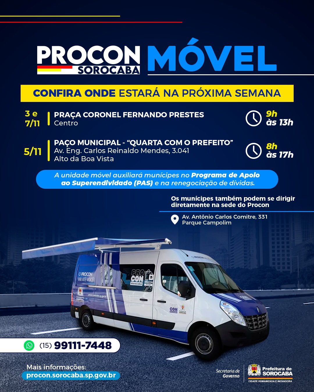 A unidade do Procon Móvel de Sorocaba estará em dois pontos da cidade, na próxima semana, com atendimentos à população. Na segunda (3) e sexta-feira (7), o serviço estará disponível na Praça Coronel Fernando Prestes, no Centro, sempre das 9h às 13h. Já na quarta-feira (5), a unidade permanecerá no Paço Municipal, em virtude da realização da 40ª edição do programa “Quarta com o Prefeito”, no Teatro Municipal, das 8h às 17h.
