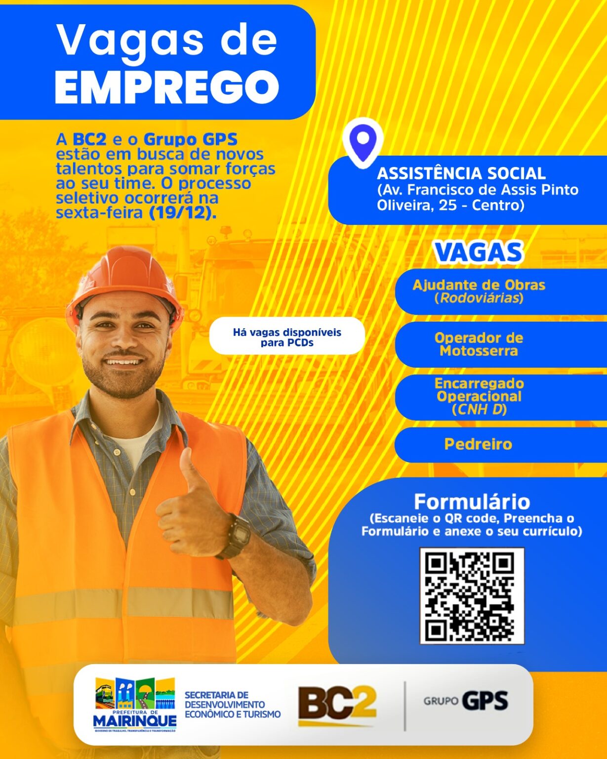 A Prefeitura de Mairinque, por meio da Secretaria de Desenvolvimento Econômico e Turismo, divulga novas oportunidades de emprego por intermédio do Programa Emprega Mairinque em parceria com as empresas BC2 e o Grupo GPS. A iniciativa tem como objetivo fortalecer a geração de emprego e renda no município.