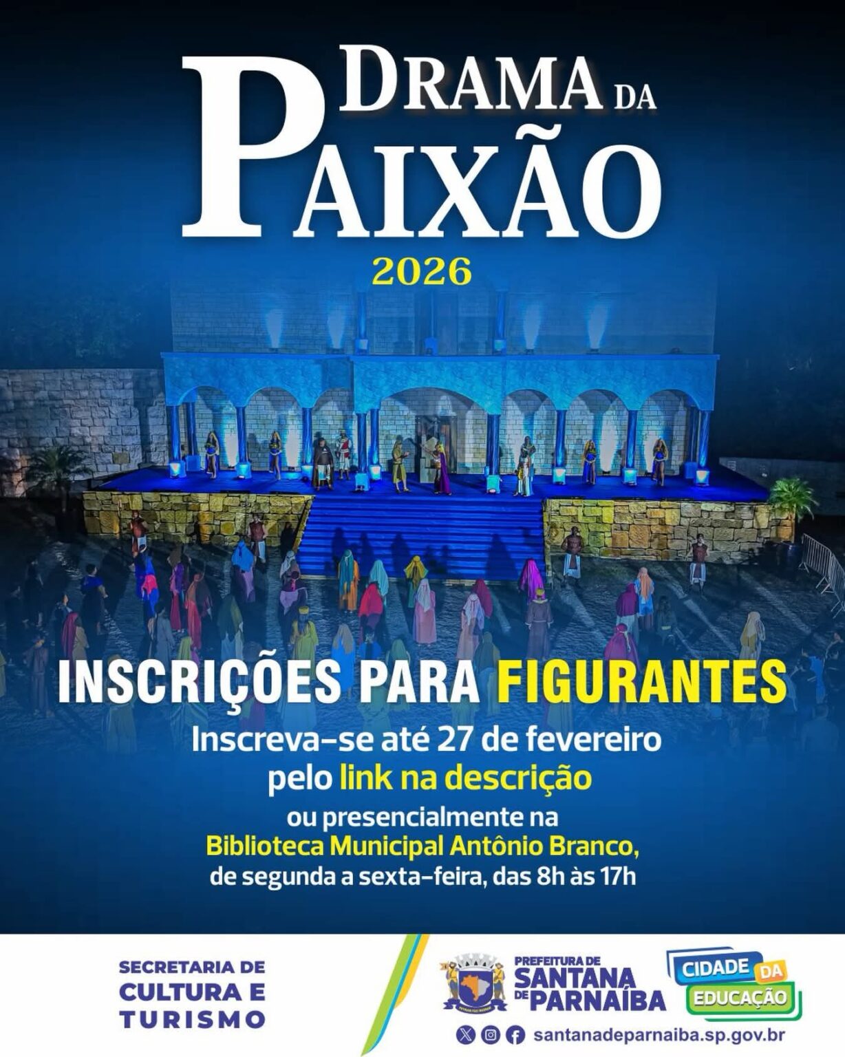 A Prefeitura de Santana de Parnaíba, por meio da Secretaria de Cultura e Turismo, está com inscrições abertas para figurantes do tradicional espetáculo teatral realizado anualmente no município, que emociona milhares de espectadores e integra o calendário cultural da região.