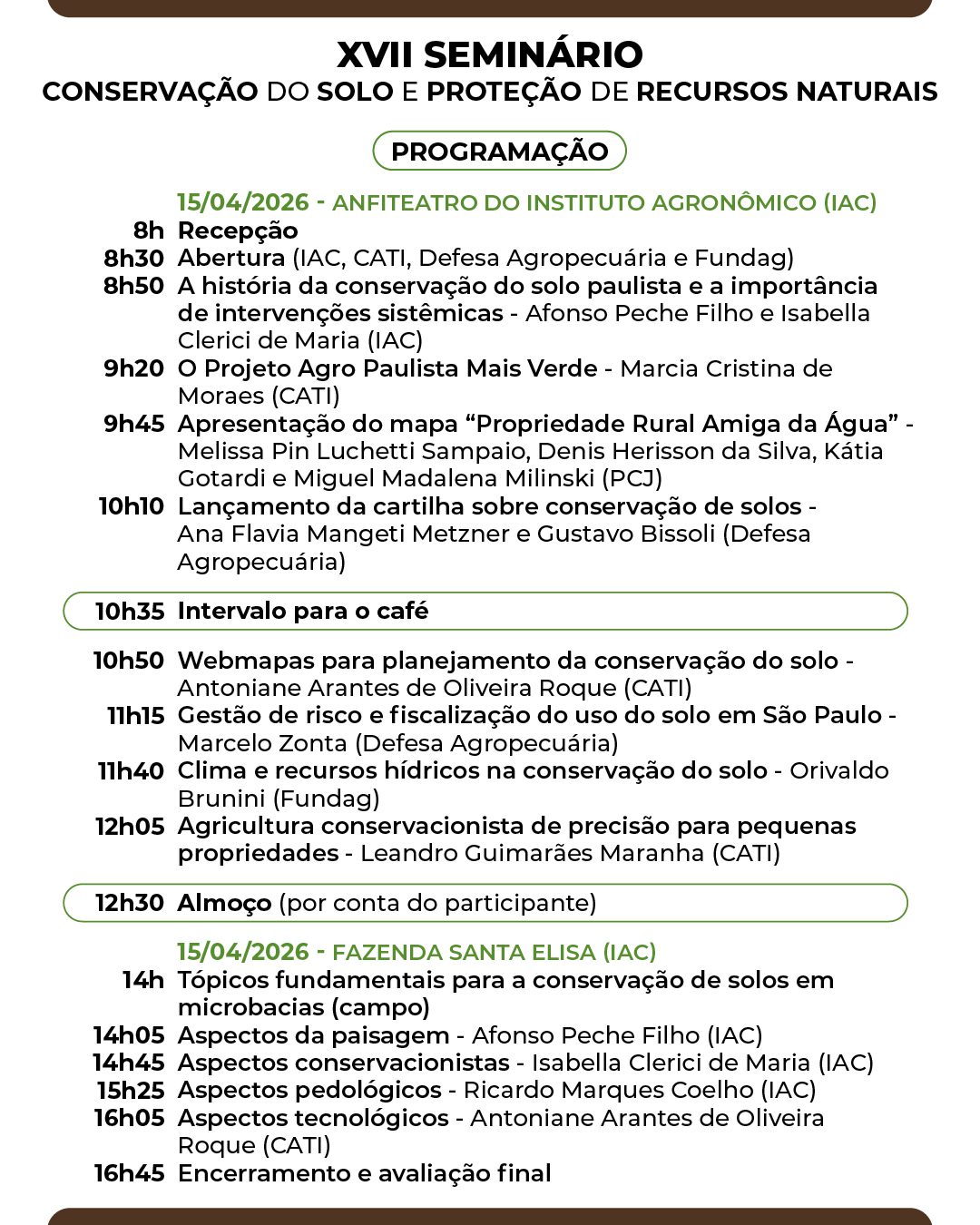 “Esperamos que o seminário traga um conjunto de entendimentos, técnicas e conhecimentos aplicáveis a manejos conservacionistas no meio rural, visando a redução da erosão e a garantia de um agro que preserve o elemento base de sua produção: o solo”, afirma o engenheiro agrícola da CATI e coordenador pedagógico desta capacitação, Antoniane Arantes de Oliveira Roque.