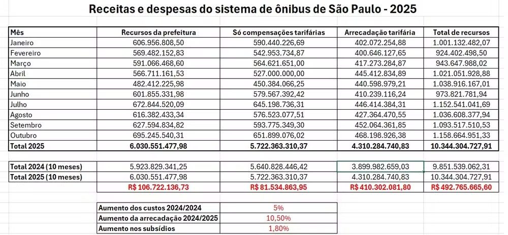 Conforme reportagem do g1 em 17 de dezembro, os custos das empresas para fazer o sistema municipal de ônibus funcionar subiram mais de R$ 492 milhões em 2025 até outubro. No mesmo período, a arrecadação da tarifa cresceu apenas R$ 410,3 milhões.