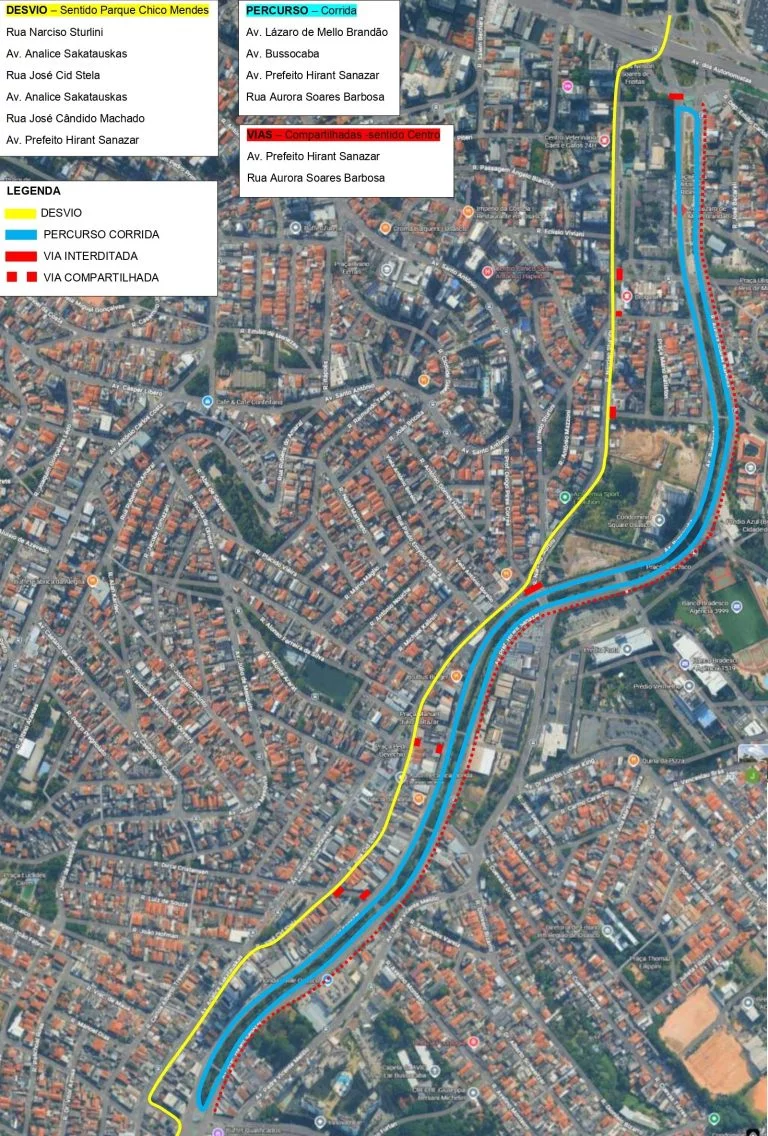 – Rua Narciso Sturlini – Avenida Analice Sakatauskas – Rua José Cid Stela – Novo trecho da Avenida Analice Sakatauskas – Rua José Cândido Machado – Avenida Hirant Sanazar (próximo ao parque). No retorno da corrida, sentido Centro, as vias serão compartilhadas: apenas uma faixa será destinada aos corredores, enquanto as demais permanecerão liberadas para o tráfego de veículos.