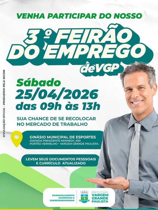 A Prefeitura de Vargem Grande Paulista realiza, no próximo dia 25 de abril, o 3º Feirão do Emprego, consolidando a iniciativa como uma importante ação de incentivo à empregabilidade no município.