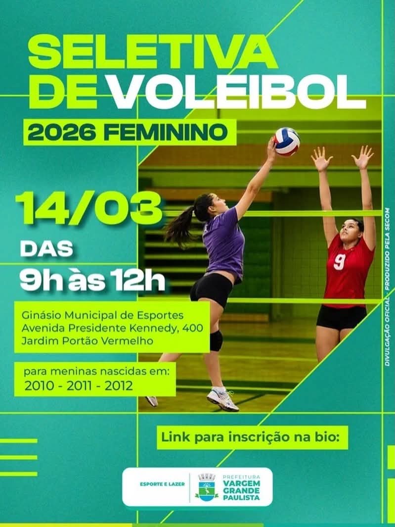 A Prefeitura de Vargem Grande Paulista, por meio da Secretaria de Esporte e Lazer de Vargem Grande Paulista, realizará no dia 14 de março a Seletiva de Voleibol Feminino 2026, iniciativa que busca identificar e incentivar novos talentos esportivos da cidade.