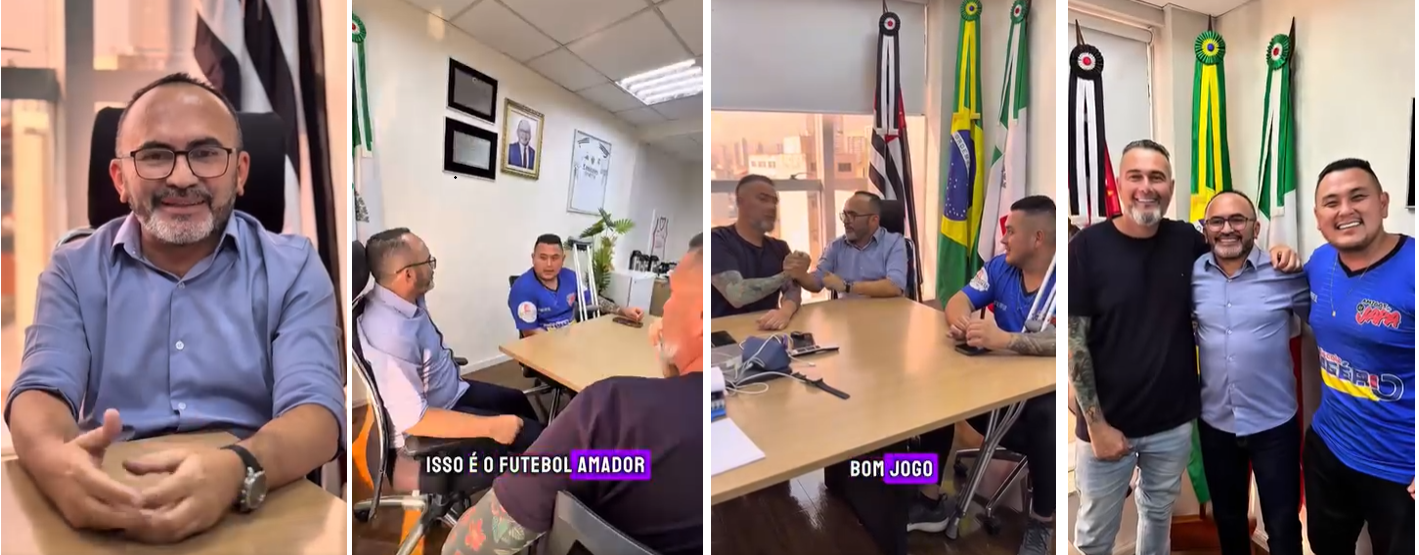 Sequência de momentos da ação solidária na Copa do Busão: o vereador Carmônio Bastos anuncia a iniciativa, reforça o espírito do futebol amador, cumprimenta o presidente do Calica e encerra ao lado de Casão (à esquerda, de camisa preta) e do vereador Maurício Japa (à direita, de camisa azul), destacando a união entre esporte e solidariedade. Crédito: Reprodução/Facebook – Reels de Carmônio Bastos